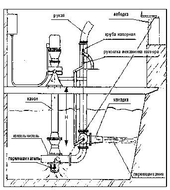 Насос комплектуется лебедкой для поднятия и опускания в приемник. Насос эксплуатируется в стационарном положении (вертикальном или наклонном) после монтажа над приемником.